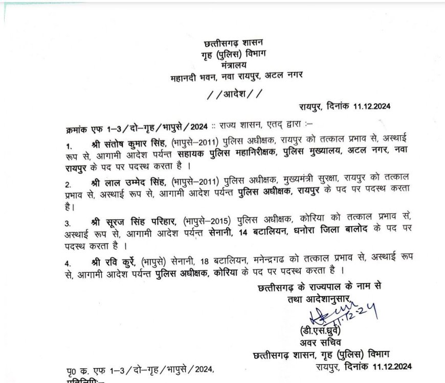 4 IPS का ट्रांसफर CG BREAKING : लाल उम्मेद सिंह होंगे रायपुर के नए SP, SSP संतोष सिंह को पुलिस मुख्यालय में मिली बड़ी जिम्मेदारी