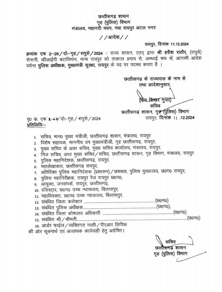 वहीं सूरज सिंह परिहार को बालोद बटालियन ट्रांसफर किया गया है। इसके अलावा राज्य पुलिस सेवा के अफसर हरीश राठौर को एसपी मुख्यमंत्री सुरक्षा की जिम्मेदारी दी गई है। हरीश राठौर से नानी VIP बटालियन माना रायपुर में पदस्थ थे। गृह विभाग के अवर सचिव डीएस धुर्वे ने आदेश जारी किया है।