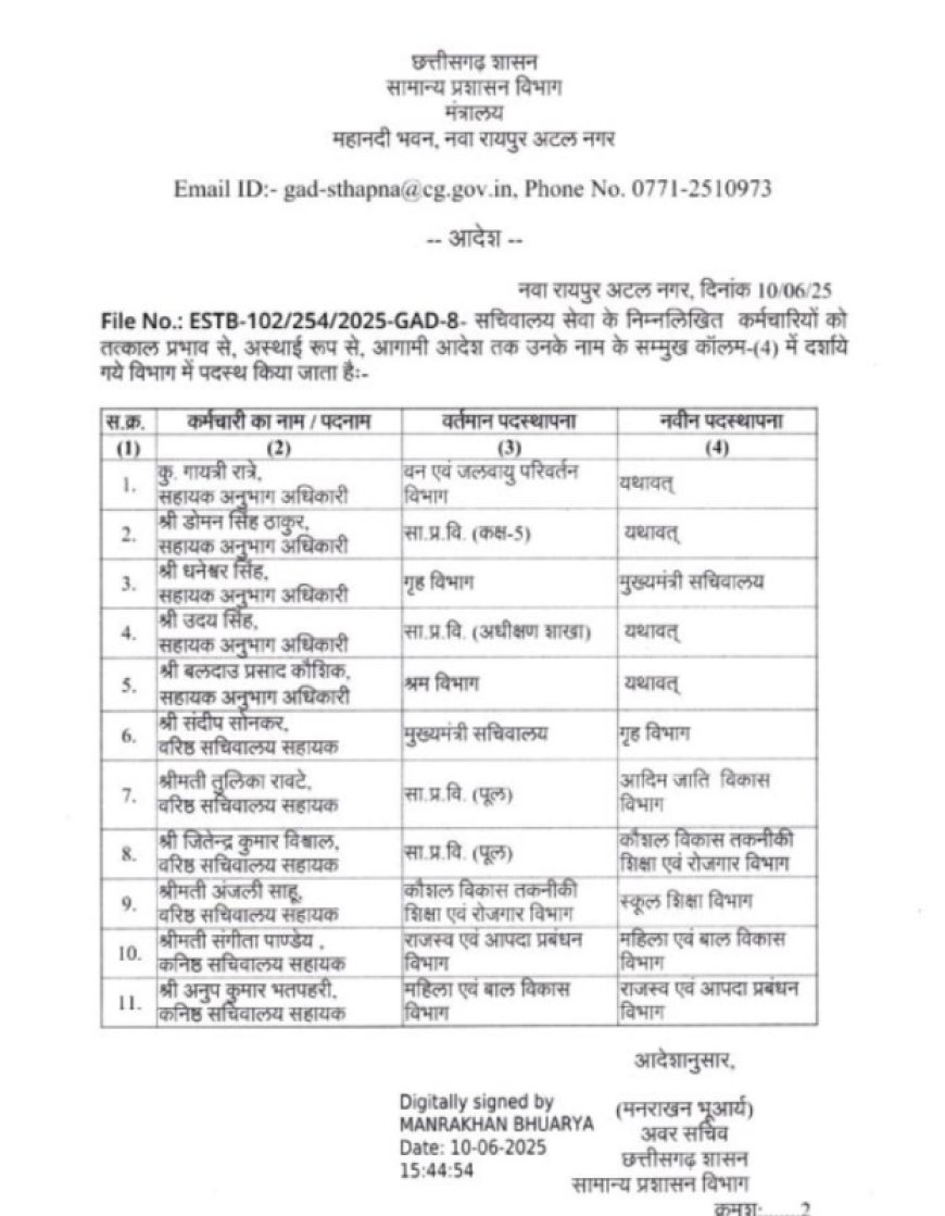 CG Transfer : मंत्रालय सेवा के 5 सहायक अनुभाग अधिकारी सहित 11 कर्मचारियों के ट्रांसफर