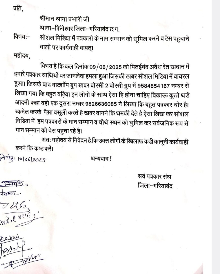 घटना से आक्रोशित जिले के पत्रकारों ने इस पूरे मामले की शिकायत फिंगेश्वर थाना में दर्ज कराई है। पत्रकार संघ ने संबंधित व्यक्तियों के खिलाफ सख्त कानूनी कार्रवाई की मांग की है। पत्रकारों का कहना है कि वे जनहित के मुद्दों को सरकार और समाज तक पहुंचाने के लिए अपनी जान जोखिम में डालते हैं, और ऐसे में इस तरह की भाषा और रवैया न केवल दुर्भाग्यपूर्ण है, बल्कि लोकतंत्र के चौथे स्तंभ पर सीधा हमला है।