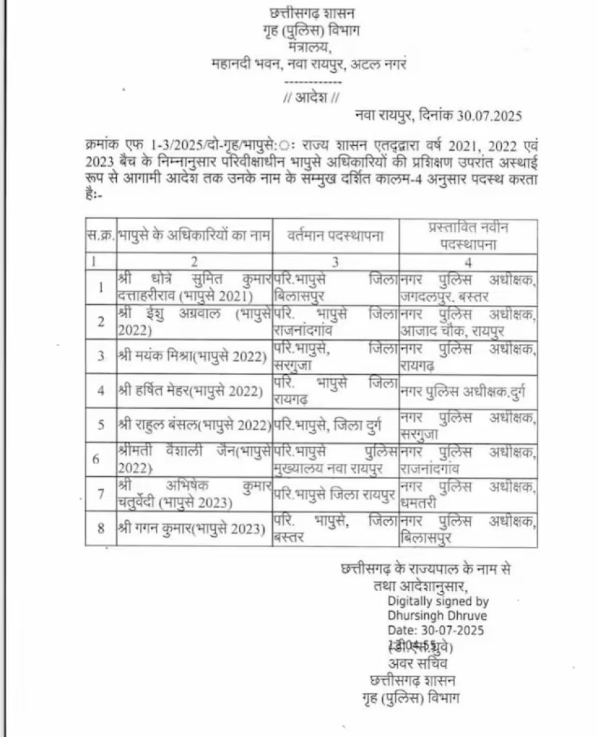 CG IPS Transfer: सरकर ने बड़ा प्रशासनिक फेरबदल किया है। गृह पुलिस विभाग ने आठ आईपीएस अफसरों की नई पदस्थापना सूची जारी की है। सूची में 2021, 2022 और 2023 बैच के अफसरों का नाम शामिल है। राज्य सरकार ने परीवीक्षाधीन अधिकारियों की प्रशिक्षण उपरांत यह आदेश जारी किया है।