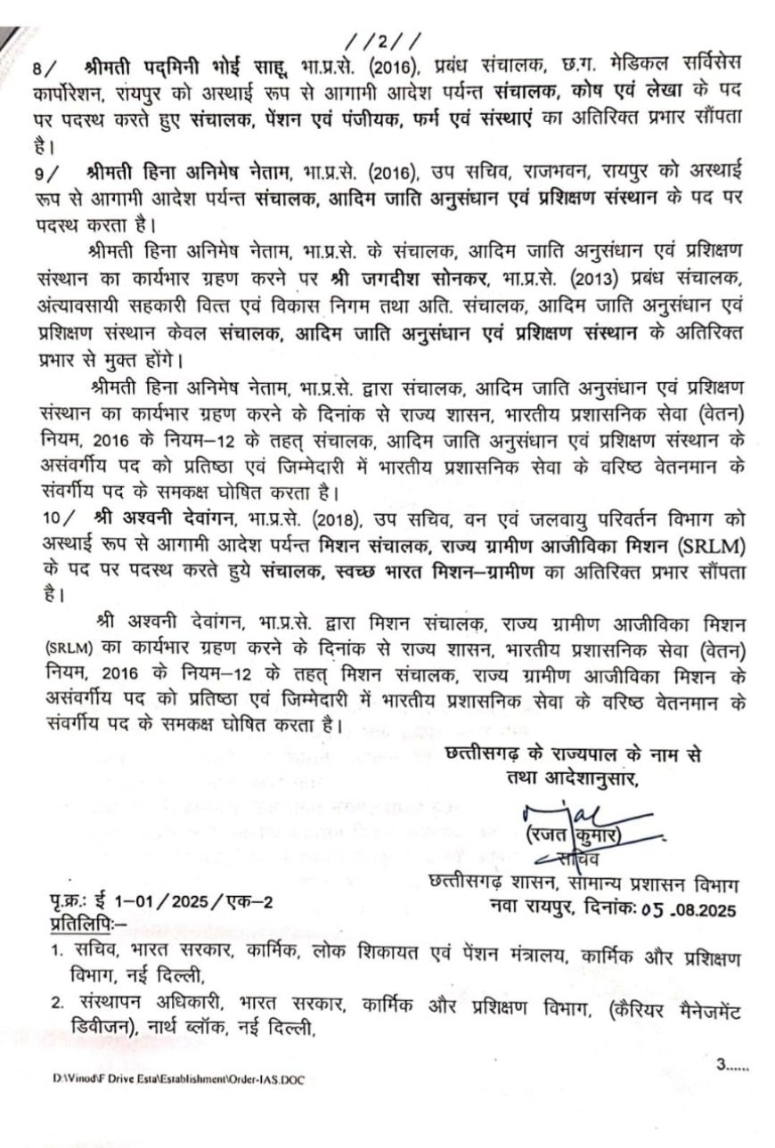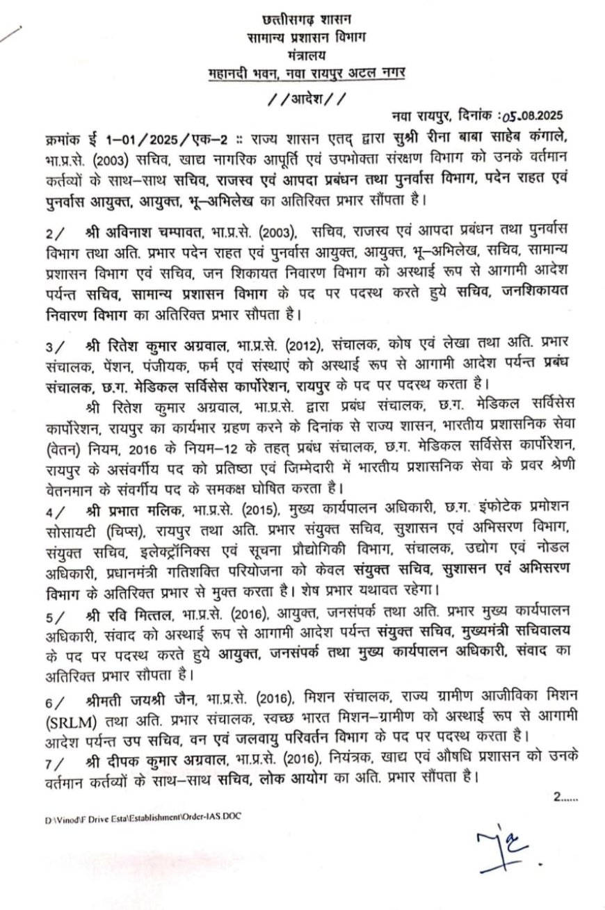 Raipur News : राज्य सरकार ने भारतीय प्रशासनिक सेवा के अधिकारीयों का तबादला किया है, जारी आदेश में कई बड़े अधिकारीयों के नाम शामिल है। IAS रवि मित्तल को बड़ी जिम्मेदारी सौंपते हुए आयुक्त जनसंपर्क व मुख्य कार्यपालन अधिकारी संवाद का अतिरिक्त प्रभार सौंपा गया है। रीना बाबा साहेब कंगाले, जो वर्तमान में खाद्य नागरिक आपूर्ति एवं उपभोक्ता संरक्षण विभाग की सचिव हैं, को राजस्व एवं आपदा प्रबंधन तथा पुनर्वास विभाग का अतिरिक्त प्रभार सौंपा गया है। वे पदेन राहत एवं पुनर्वास आयुक्त तथा आयुक्त, भू-अभिलेख का भी दायित्व संभालेंगी। अविनाश चम्पावत, जो वर्तमान में राजस्व विभाग में सचिव हैं, को अब अस्थायी रूप से आगामी आदेश तक सामान्य प्रशासन विभाग के सचिव पद पर पदस्थ किया गया है। साथ ही उन्हें जन शिकायत निवारण विभाग का अतिरिक्त प्रभार सौंपा गया है।